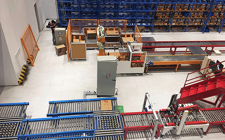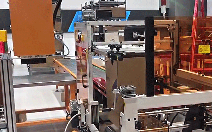 自動(dòng)拆箱機(jī)自動(dòng)完成開(kāi)箱、成形、下底折葉折曲。并現(xiàn)時(shí)完成下部分膠帶粘貼,將疊成紙板的箱板自動(dòng)打開(kāi),箱子底部按一定程序折合,并用膠帶密封后輸送給裝箱機(jī)的專(zhuān)用設(shè)備。