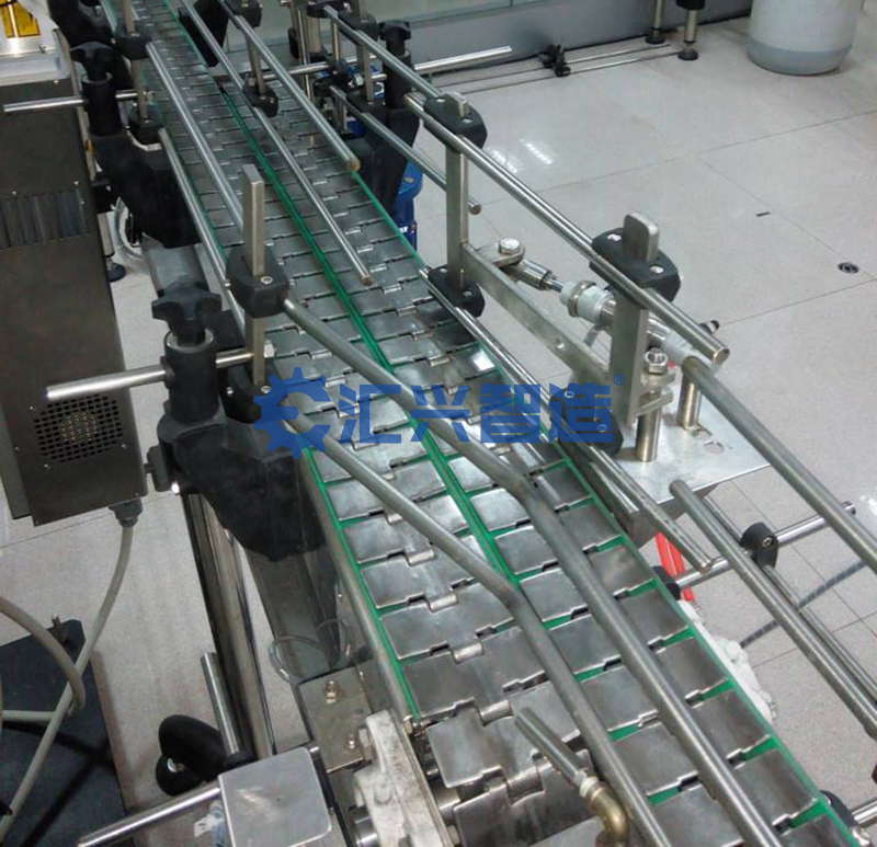 鏈板輸送線以標(biāo)準(zhǔn)鏈板為承載面,由馬達(dá)減速機(jī)為動(dòng)力傳動(dòng);我們可以通過多列鏈板并行,使鏈板輸送線做的很寬并形成差速,利用多列鏈板的速度差使多列輸送在無擠壓的情況下變?yōu)閱瘟休斔?,從而滿足飲料貼標(biāo)、灌裝、清洗等設(shè)備的單列輸送的要求,同樣也可以使單列變成多列并行走緩慢,從而產(chǎn)生儲(chǔ)存量,滿足殺菌機(jī)、儲(chǔ)瓶臺(tái)、冷瓶機(jī)的大量供料的要求,我們可以將兩條鏈板輸送線的頭尾部做成重疊式的混合鏈?zhǔn)沟闷浚ü蓿w處于動(dòng)態(tài)過度狀態(tài),使輸送線上不滯留物料,可以滿足空瓶以及實(shí)瓶壓力和無壓力輸送。